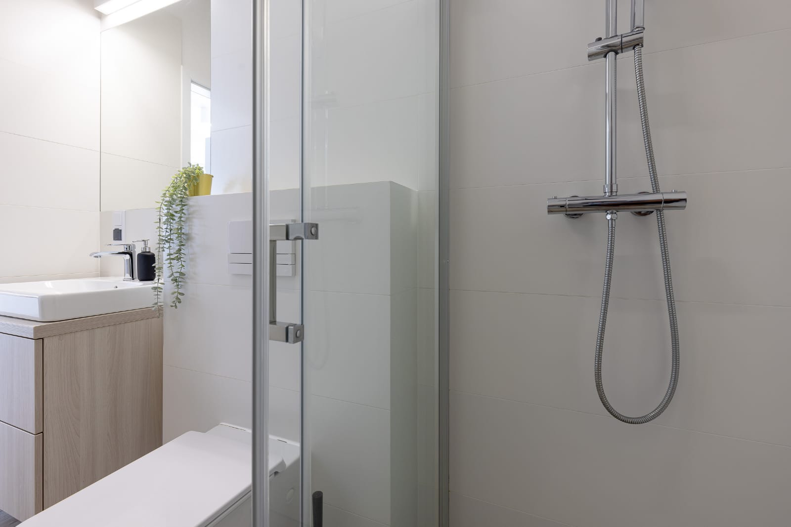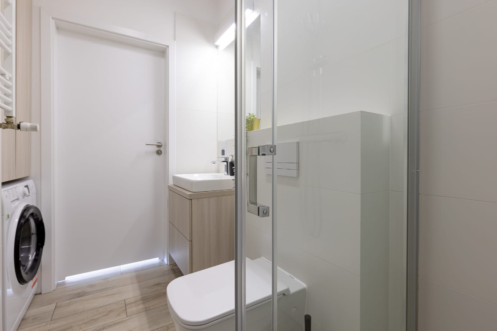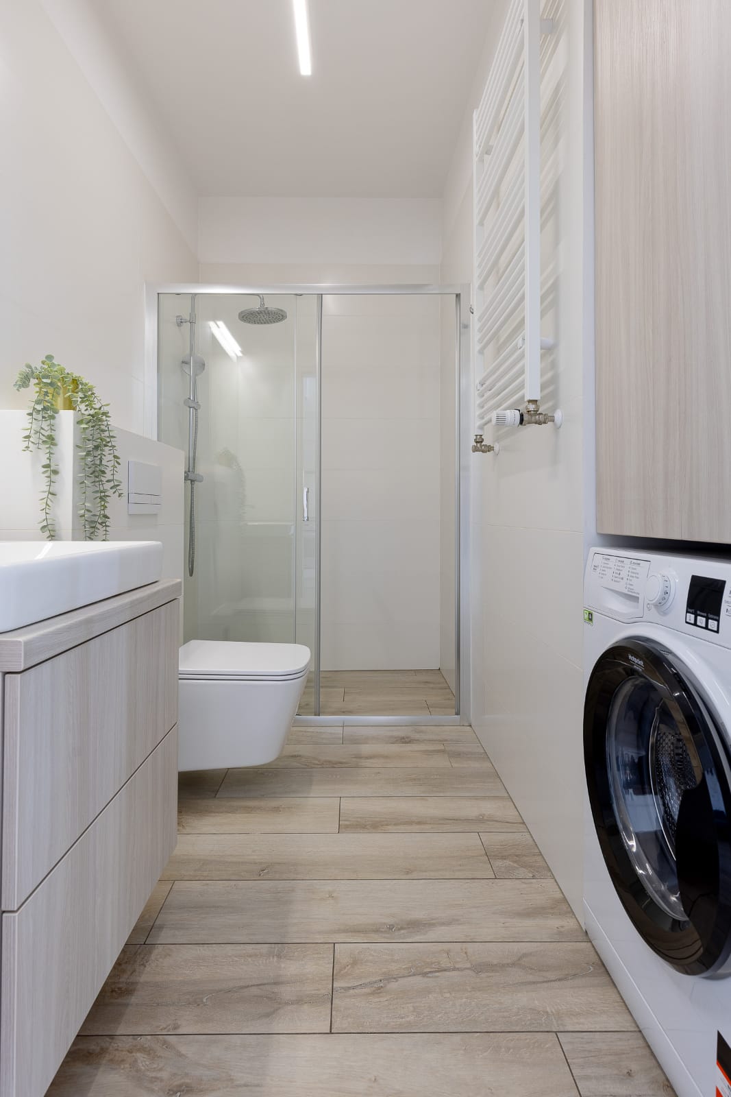 Przestronna łazienka z prysznicem oraz pralką na wyposażeniu. Dla gości przygotowany komplet przyborów higienicznych oraz suszarka do włosów.