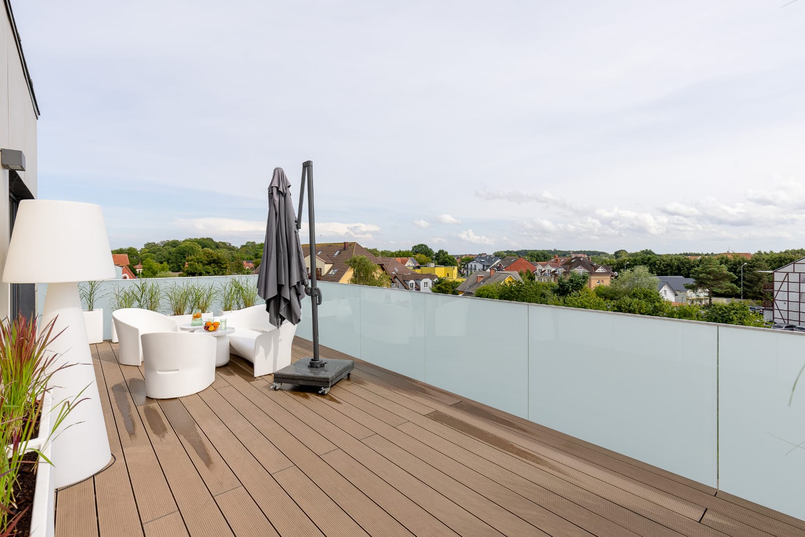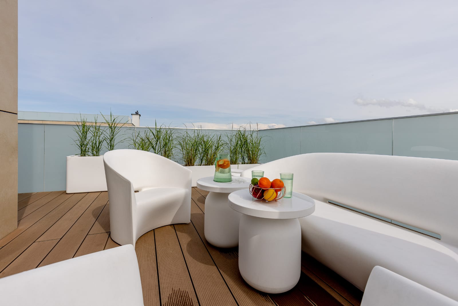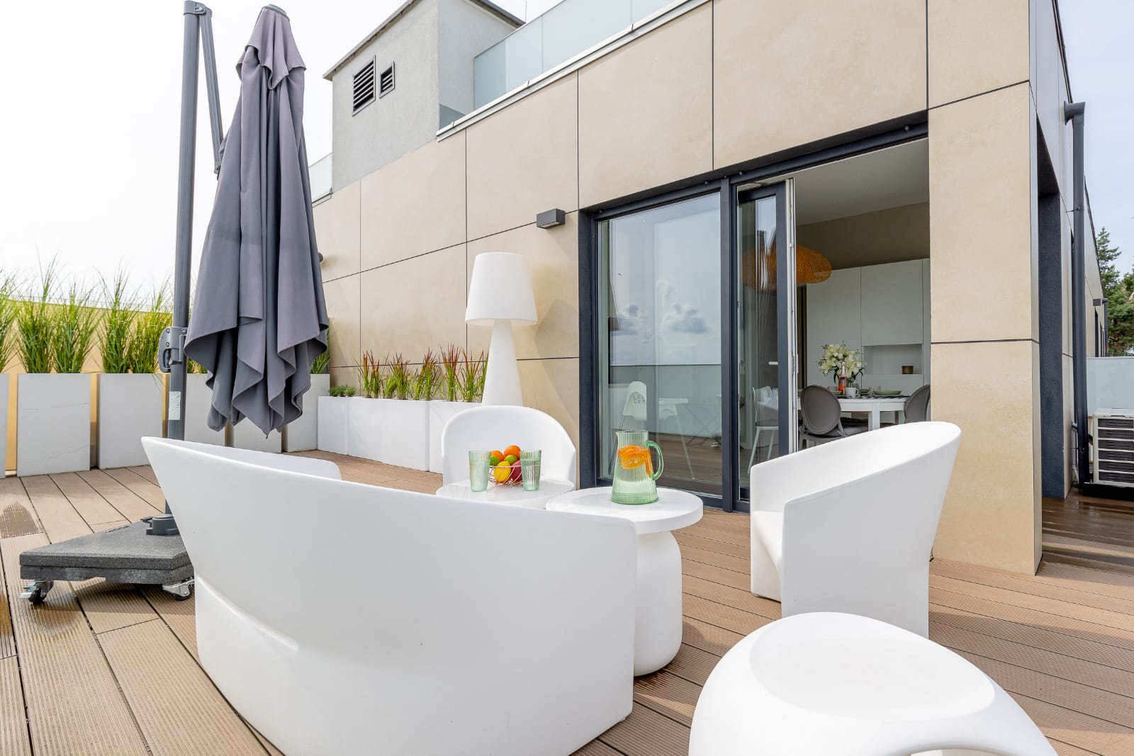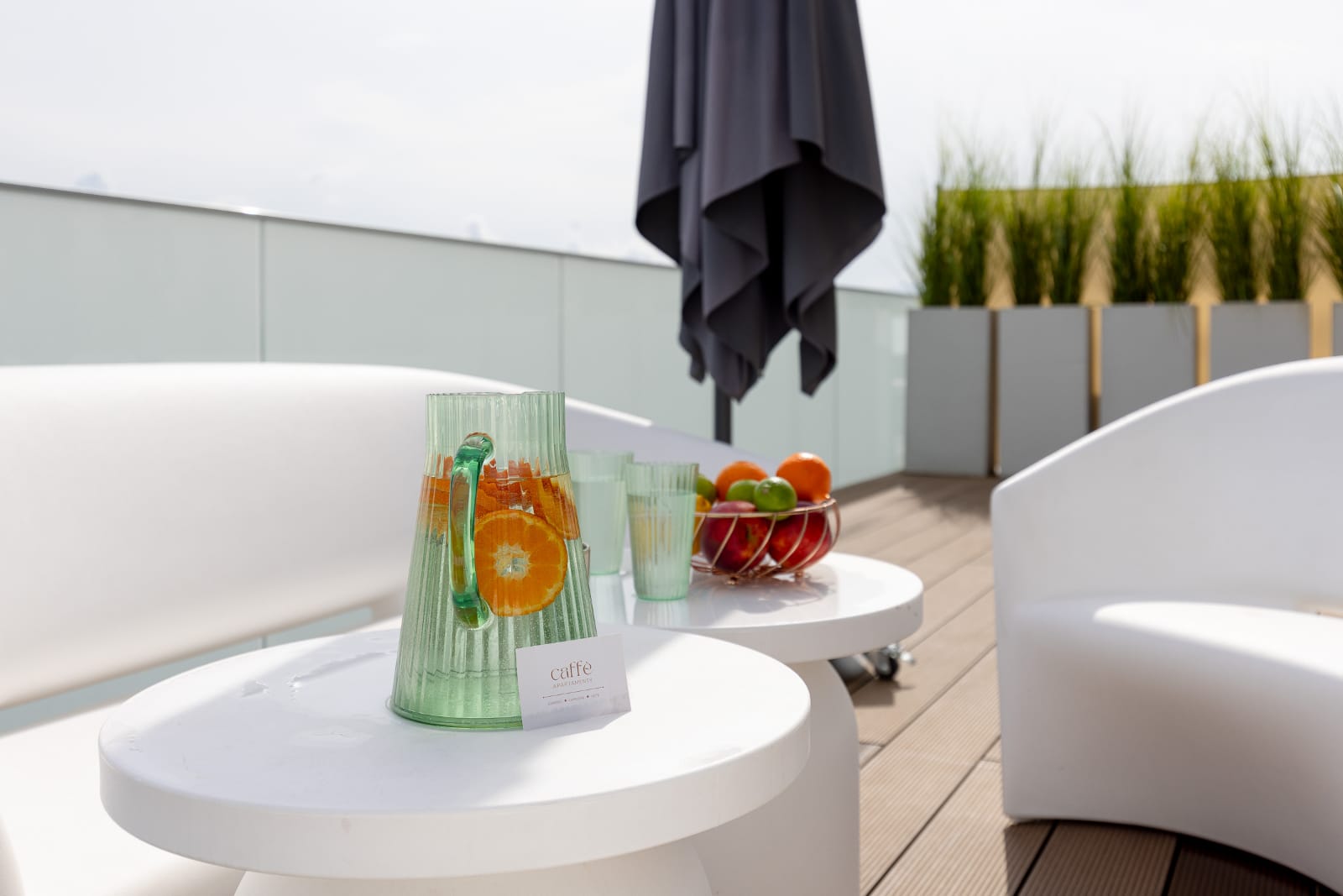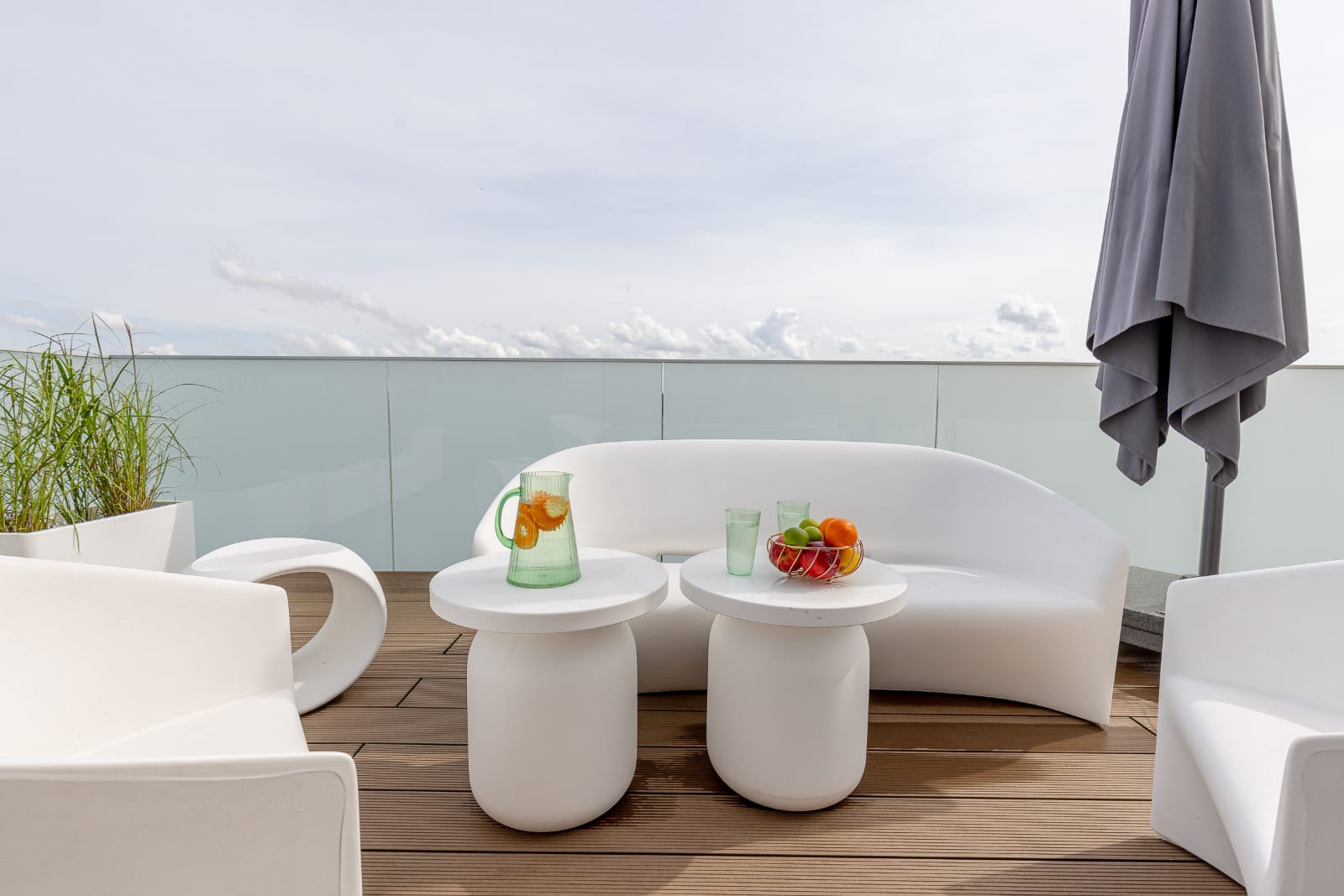 Elementem wyróżniającym apartament jest słoneczny taras. Przestronny, wyposażony w wygodne meble oraz parasol. Stanowi idealne miejsce aby zjeść posiłek na świeżym powietrzu z widokiem na oddaloną o 100 metrów plażę i morze. Do apartamentu przynależy miejsce parkingowe w garażu podziemnym budynku. Cały apartament jest klimatyzowany, która świetnie się sprawdza w upalne dni.